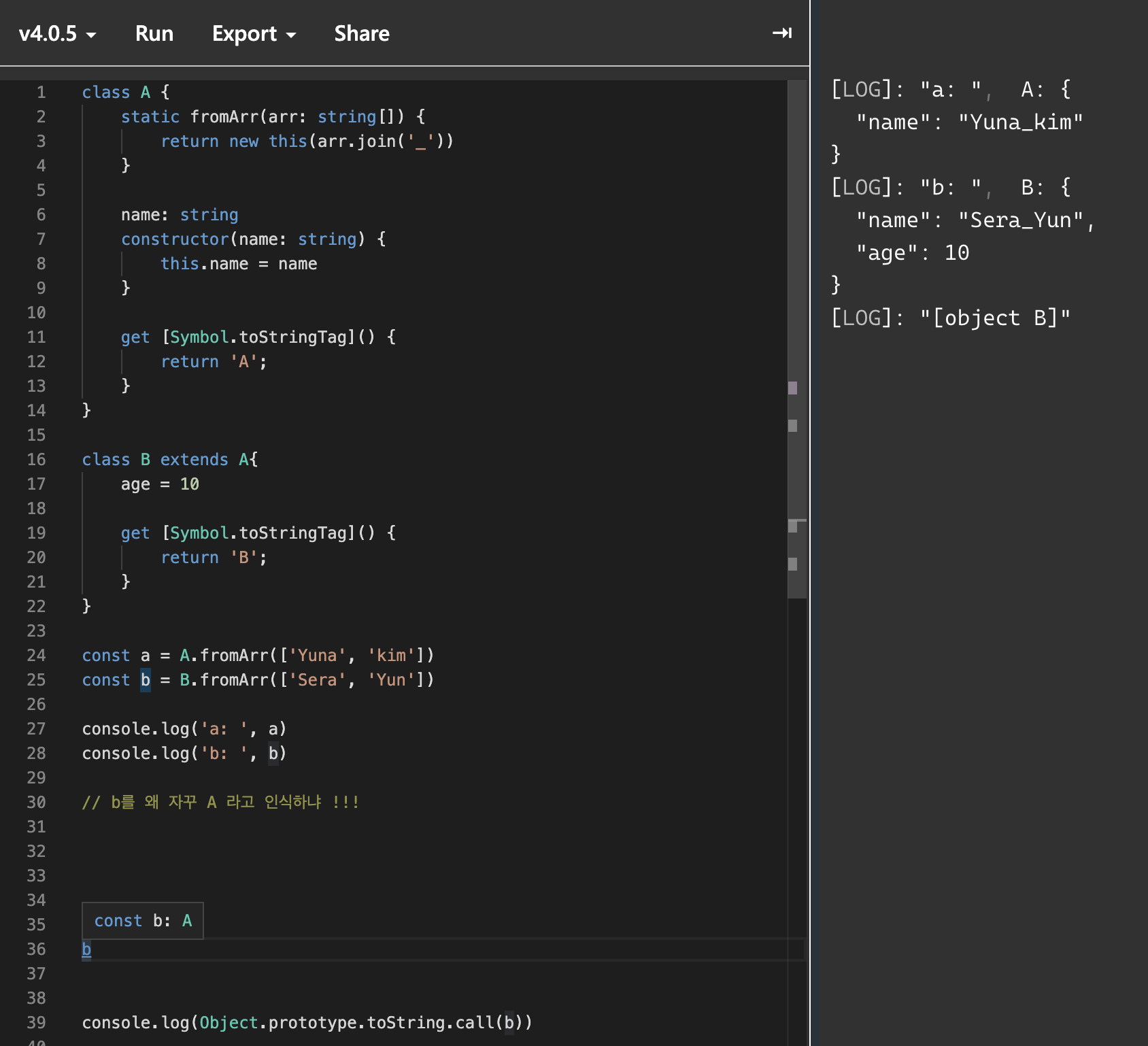 얼마전에 발견한 아직도 해결 못한 정말 해결하고 싶은 문젠데... 내가 의도한건 static 메소드인 fromArr를 B가 상속받아서 new this 했을때 B가 나오기를 의도 했는데 저 const b: A 라고 나온 것처럼 타입스크립트에서 A 라고 인식을 해버린다.