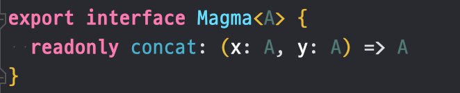 interface Semigroup<A> { readonly concat: (x: A, y: A) => A }